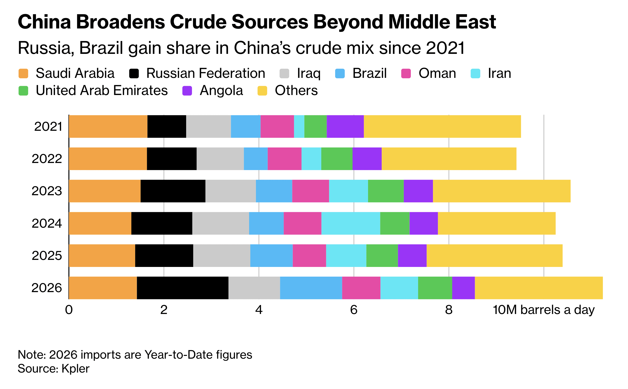 “While nearly half its crude still originates in the Middle East, China sources oil from almost every continent. Its firms hold stakes in projects in more than a dozen countries, from South America to the North Sea, spreading the risk beyond any single region,” reports Bloomberg News.