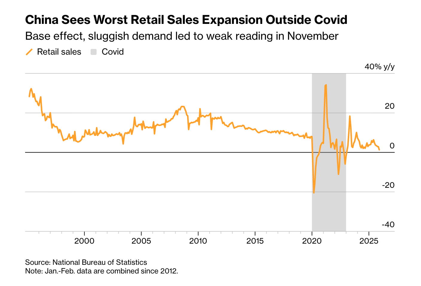 China’s retail sales eke out 1.3% growth in November, the weakest rate since 2022. Industrial production rises 4.8%, down from 4.9% growth a month earlier. And fixed asset investment drops 2.6% in the first eleven months of the year, worse than the 1.7% fall January through October.