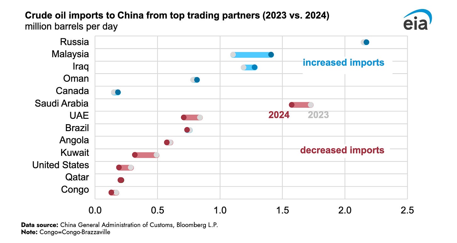 Keep in mind that as the world’s largest crude importer, China has energy relations with a lot of other countries in the Middle East beyond Iran, including Saudi Arabia, Kuwait, Iraq, Oman and the UAE.