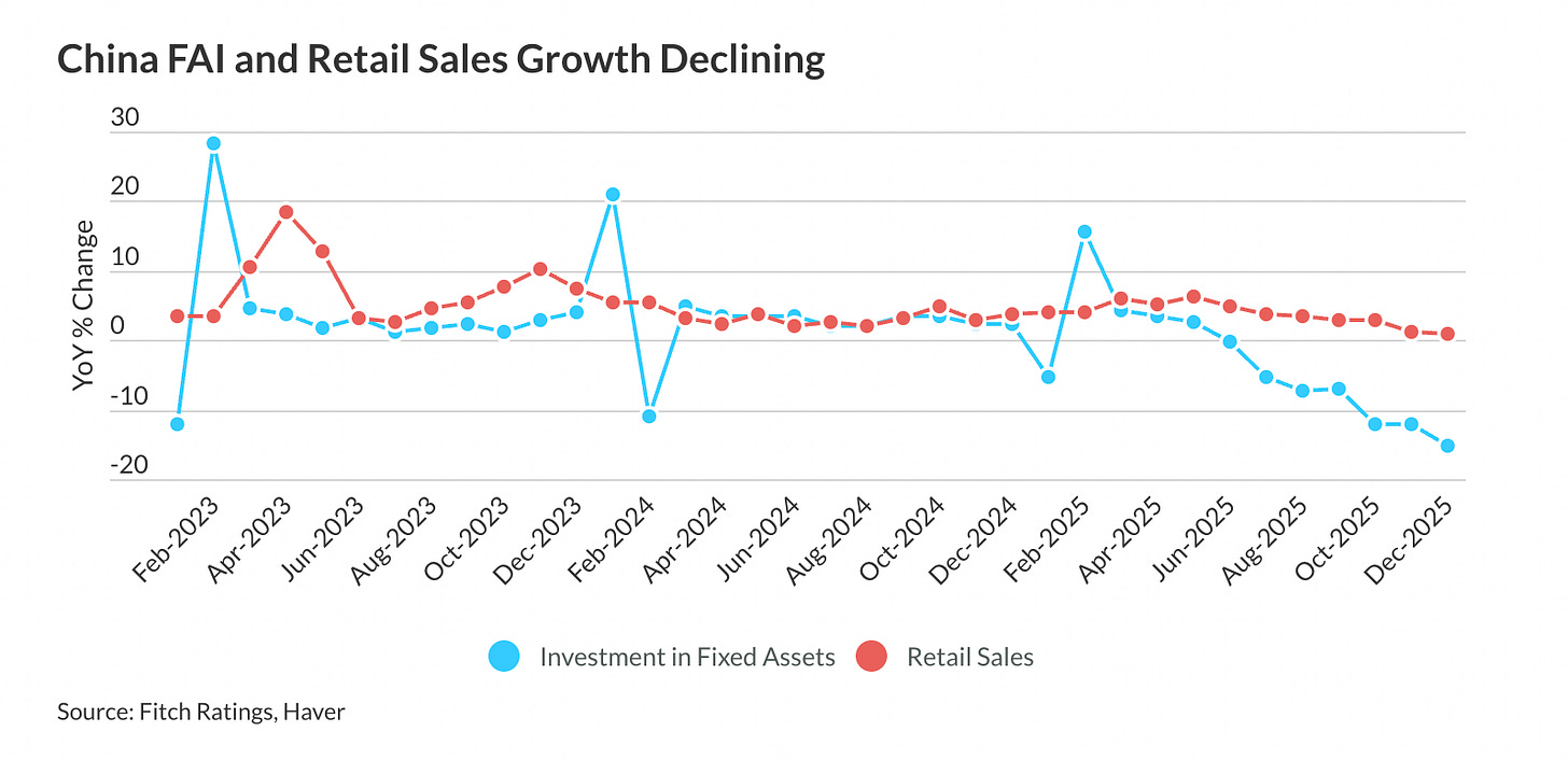 “Domestic demand will remain constrained by sluggish consumer confidence, deflationary pressures, and investment headwinds that have broadened beyond the property-sector correction and are amplified by the local-government debt overhang,” writes Fitch Ratings, which is predicting just 4.1 percent growth this year.